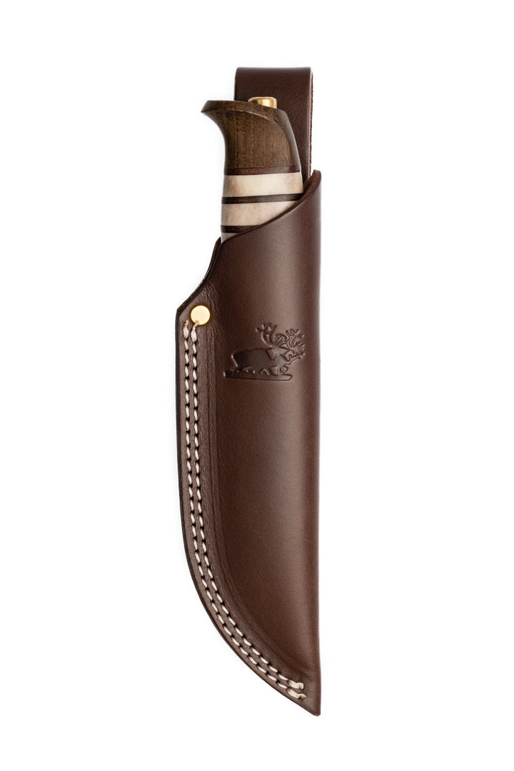 The knife comes in a sheath made from genuine, vegetable-tanned brown leather and features a Reindeer print on the front.