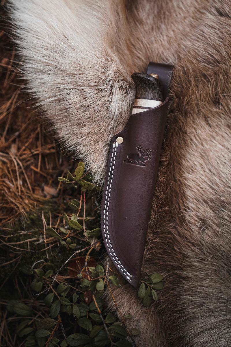The knife features a scandi grind, 9 cm highly polished blade in our laminate H3LS steel. The composite handle has an ample belly built by equal parts leather and reindeer antler inlets, framed by a front and back piece in dark oak. The shape is that of a classic, Norwegian outdoor knife, ideally suited to most things you need a knife for when venturing out either for your Sunday trip or longer adventures.